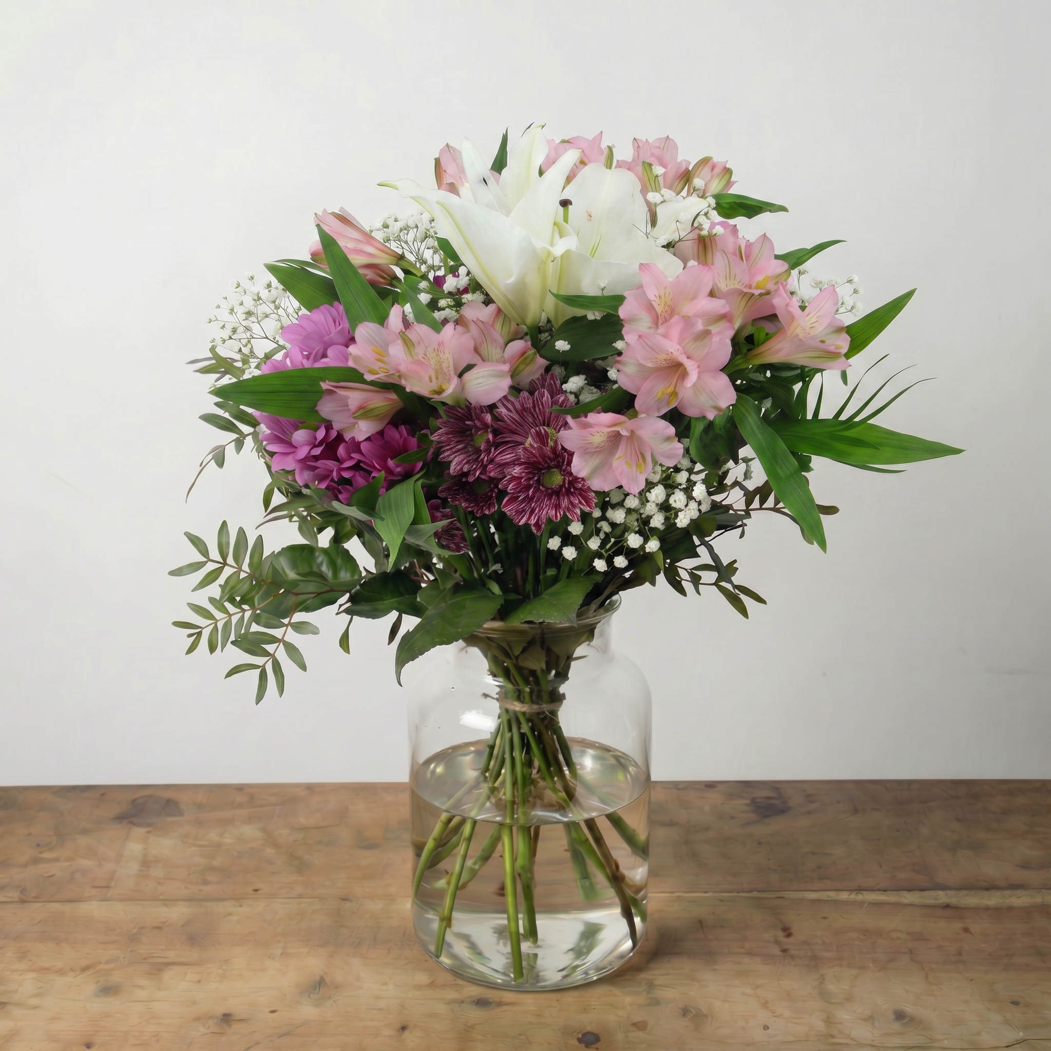 Este ramo combina la suavidad de las alstroemerias rosas, el protagonismo de los lirios blancos orientales y el encanto de las gerberas y hortensias en tonos malva y púrpura. Todo ello complementado con paniculata blanca, hojas de palmera, ruscus y eucalipto, creando un conjunto lleno de volumen, textura y vida.