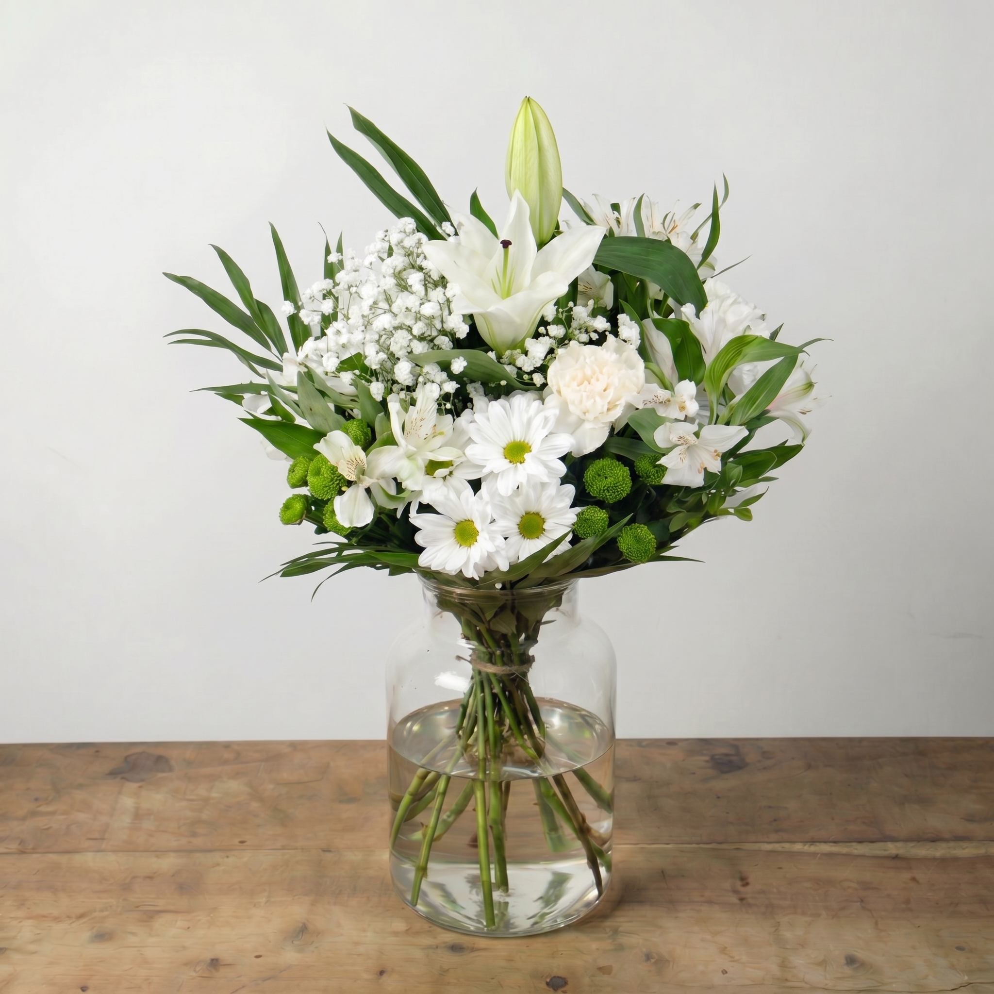 Ramo natural y elegante en tonos blancos y verdes con lirio oriental, margaritas, alstroemerias, clavel y paniculata.
